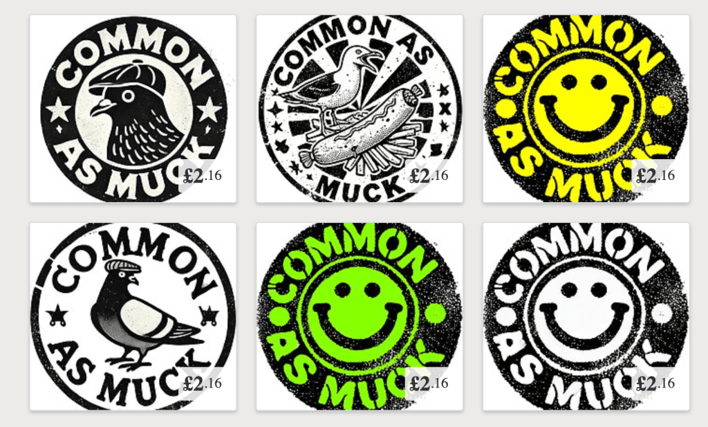 I’m a bit of a northern Del Boy, so of course I’m selling some shit! No market stalls in Peckham here, instead you can buy it through the comfort of your own home, or browse some incredible ‘COMMON AS MUCK’ and other wonderful designs on your mobile phone.